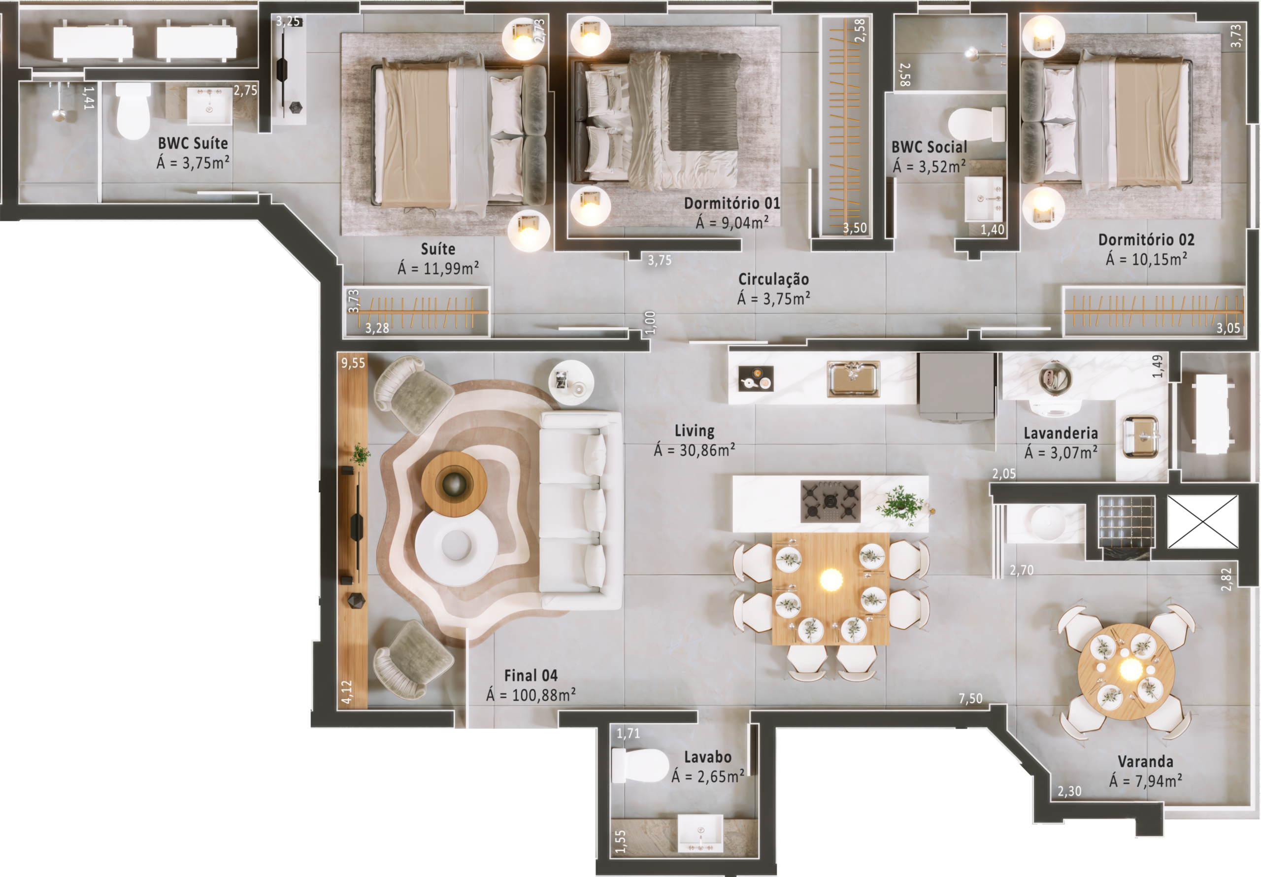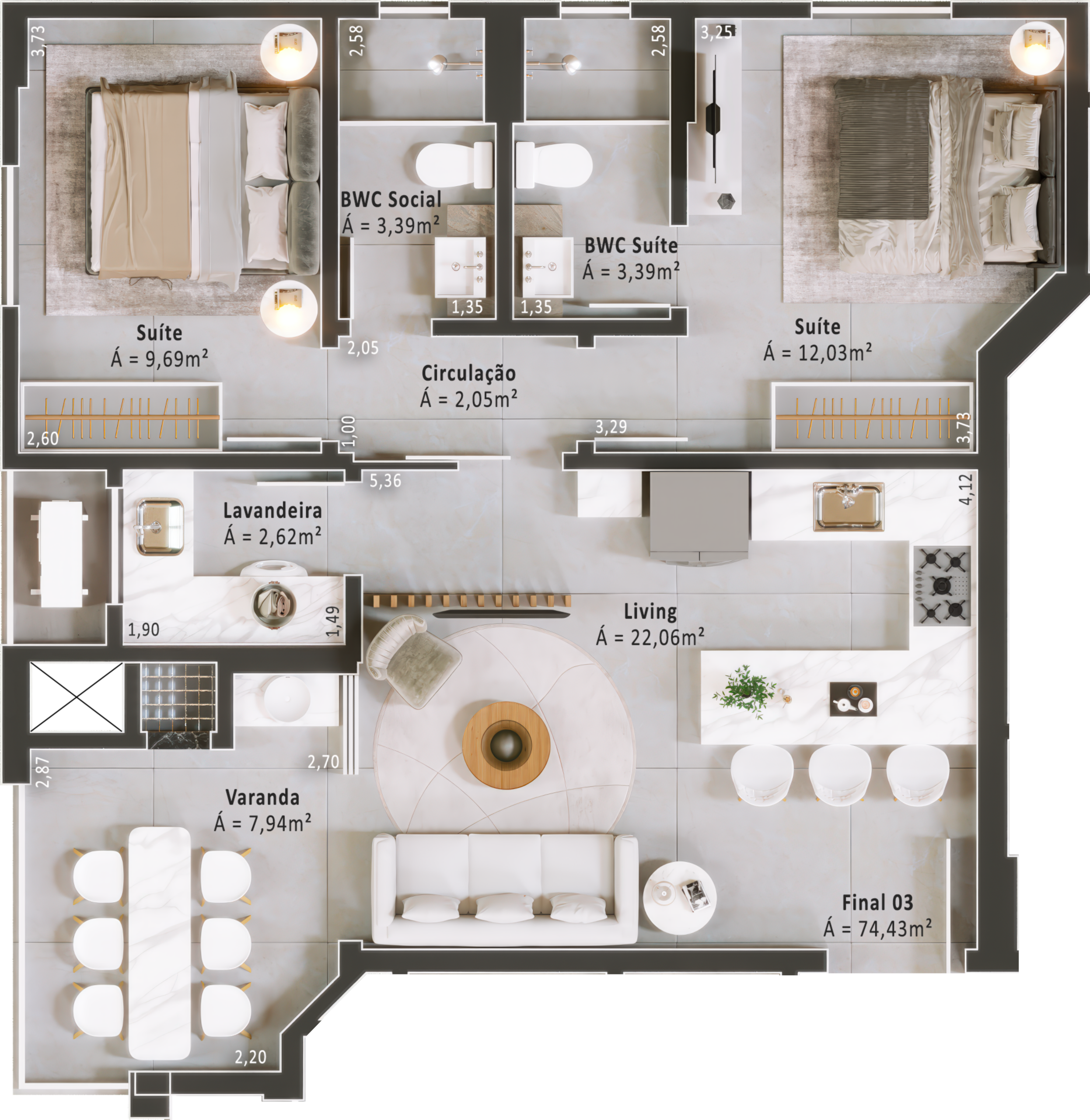 Áreas internas revestidas com porcelanato 90x90